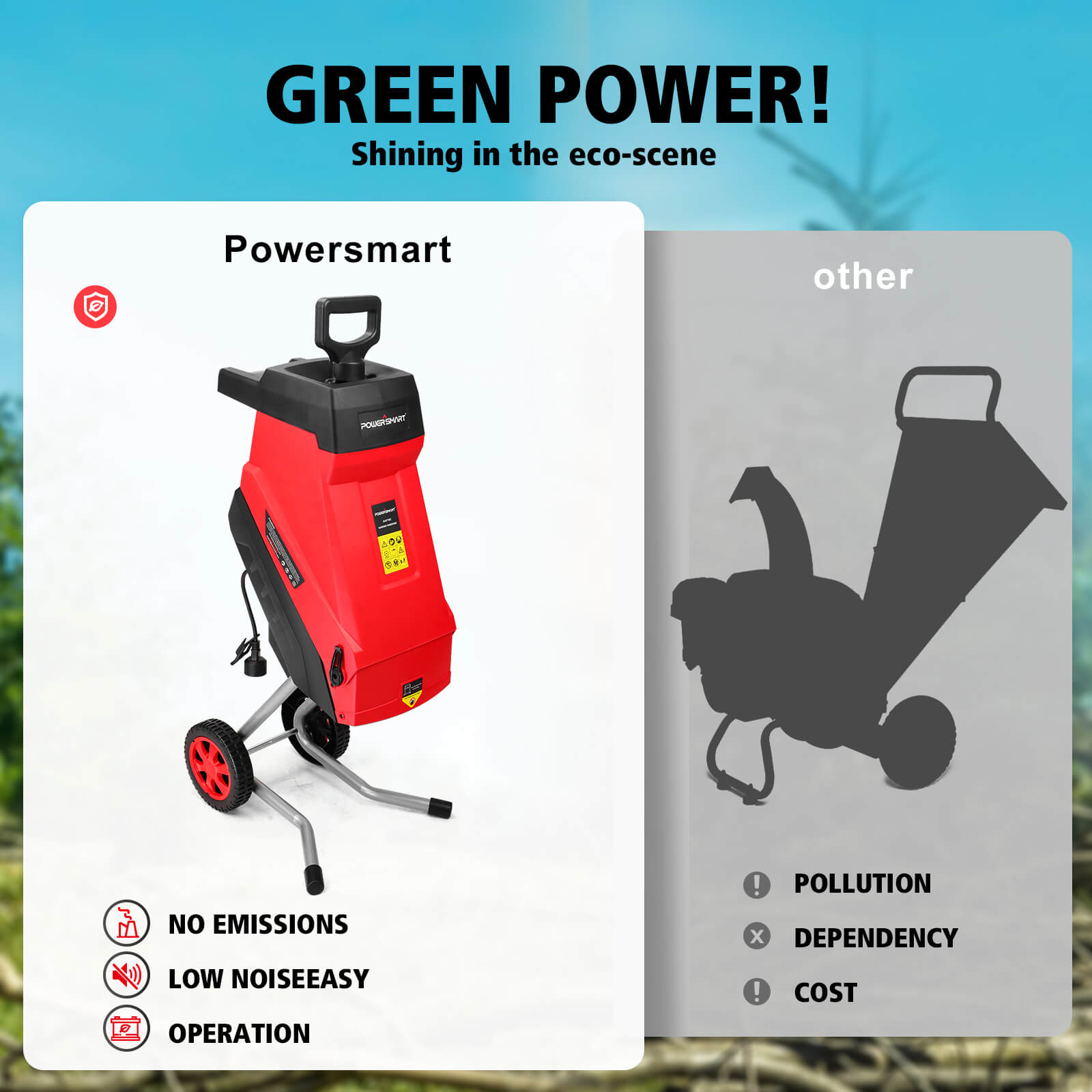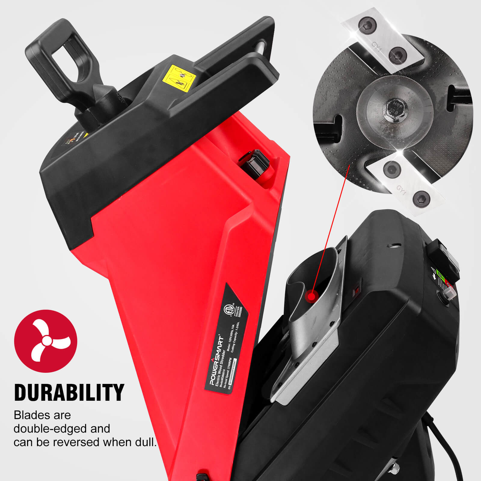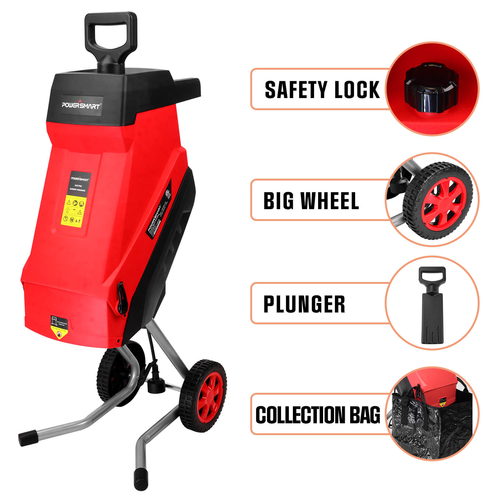 ● Powerful mulcher chipper: with a 15-amp electric motor to shred branches up to 1.77" thick, provides long machine life, and silent design.
