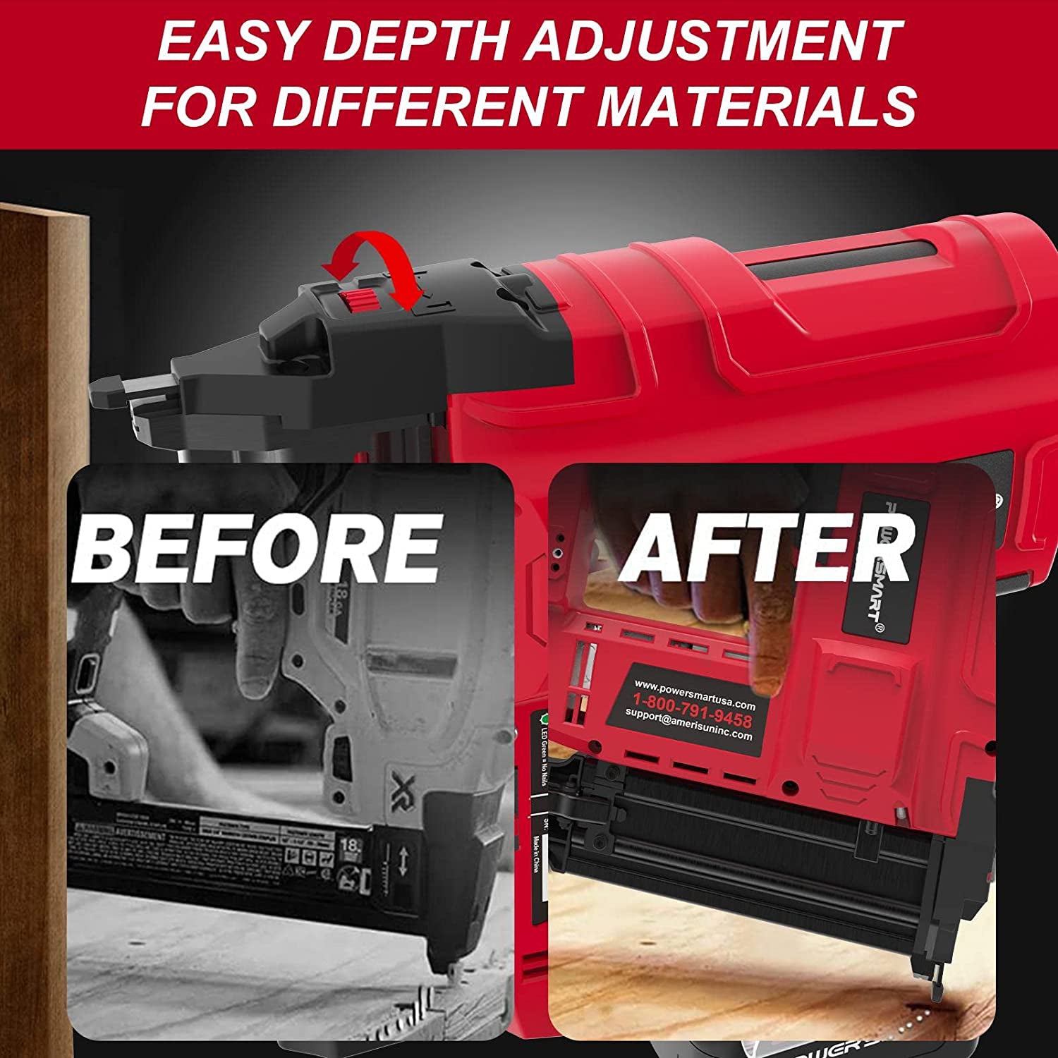 Adjustable Depth of DriveTool-free depth adjustment for flush and precise countersinking of nails. nail gun battery powered is able to drive 18 GA brad nails from 3/4 in to 2 in, making the nailer ideal for fastening decorative molding, casing, kitchen crown, and shoe molding. |