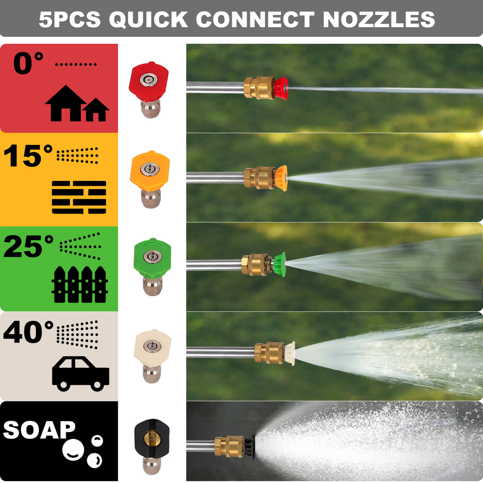 ● 5 Quick-Connect Nozzles: Choose from 0°, 15°, 25°, 40°, or soap for any cleaning job.